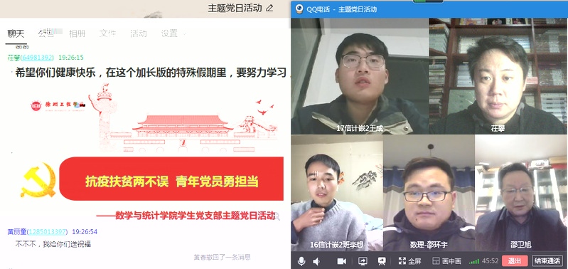黨日活動上,數統學院黨總支書記邵衛旭首先了解幫扶學生、學校、所在地區的疫情防控工作和目前孩子們的學業情況。随後學生黨員王成開展線上課程,通過視頻會議對幫扶學生開展疫情形勢、防控知識、衛生知識等方面的宣傳,及時傳達疫情防控的要求和信息。學生黨員李想針對需幫扶學生的學習情況,建立線上一對一幫扶,交流學習經驗,開展線上授課,上傳學習資料。學生黨支部邵環宇老師通過視頻和圖文的形式向小朋友們講述國家和數統學院學生黨員作為最美逆行者的優秀事迹。學生黨支部書記茌攀詢問了孩子們疫情期間學習安排、課程設置和課外活動情況,組織學生黨支部建立線上幫扶愛心群,制定幫扶計劃,形成黨員分組負責制,建立完整的對接渠道和幫扶體系,随時幫助他們的日常學業。