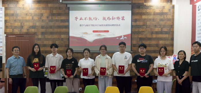 優秀校友代表彭永祺,也是學院首任校友聯絡員,結合個人成長經曆,熱情鼓勵學弟學妹葆有學習熱情,勇敢追逐夢想。他鄭重承諾将全力支持學院校友工作,為母校發展貢獻力量。随後,2025屆校友聯絡員代表深情回憶了在數統學院四年的成長曆程與蛻變感悟。獲聘校友聯絡員,他們深感這不僅是一份榮譽,更是一份沉甸甸的責任。代表們一緻表示,将切實發揮橋梁紐帶作用,确保數統學子與母校始終心手相牽,并矢志傳承數統精神,以實際行動回饋母校培育。