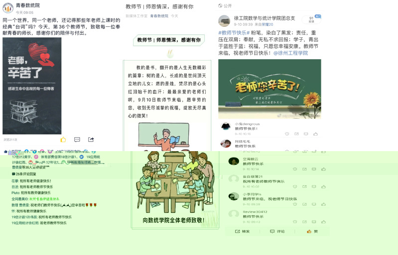 真情感恩,舉辦線上線下學生創意送祝福活動。開展溫馨短視頻、直播表達感恩、微博蓋樓、QQ空間感恩傳遞、專題微信等形式的線上送祝福活動。舉辦集體祝福、信件答謝、創意合影照、DIY祝福卡等形式的線下慶祝活動,鼓勵學生積極運用多種形式表達對廣大教師的誠摯祝福和衷心感謝。