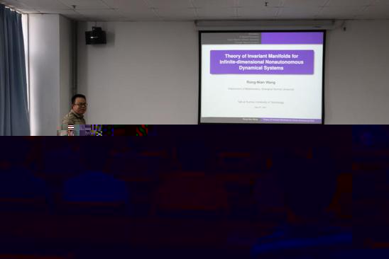 王榮年教授的報告題目為“Theory of Invariant Manifolds for Infinite-dimensional Non- autonomous Dynamical Systems”。他指出,不變流形理論對研究無窮維系統的局部或全局動力學具有重要的作用,而非自治系統的不變流行研究難度更大。王教授首先介紹了報告内容的研究框架,分析了研究所用到的概念和工具,最後給出了主要研究結果。