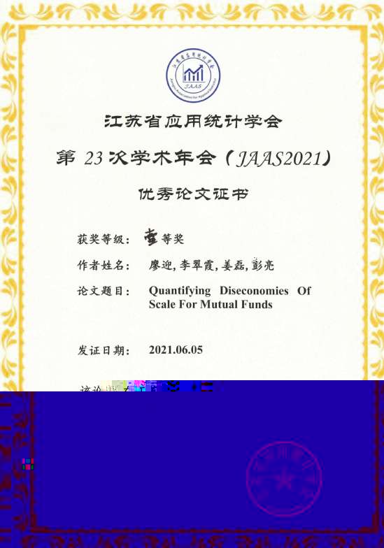 江蘇省應用統計學會第23次學術年會(JAAS2021)由江蘇省應用統計學會主辦,于6月4-6日在淮陰工學院隆重召開。本次年會以“大數據時代的統計學及其應用”為主題,來自省内外34個單位的128名專家和學者參加了會議。我院教師李翠霞博士在本次會議上作了題為“Quantifying Diseconomies of Scale for Mutual Funds”的學術報告,得到了與會專家和學者的一緻好評,并獲得江蘇省應用統計學會第23次學術年會(JAAS2021)優秀論文一等獎。