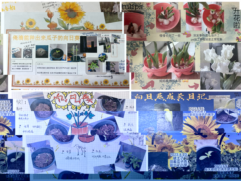 本次活動為期40餘天,共分為植物種植和創意展示兩個階段。活動報名參與者在領取向日葵、郁金香等植物種子與土壤、花盆等工具後精心種植并養護自己的植物,期間相互分享拍照記錄植物的生長過程。創意展示階段,參與者為自己的植物制作植物觀察日記手賬并進行線下展示,分享種植中的心得體會。
