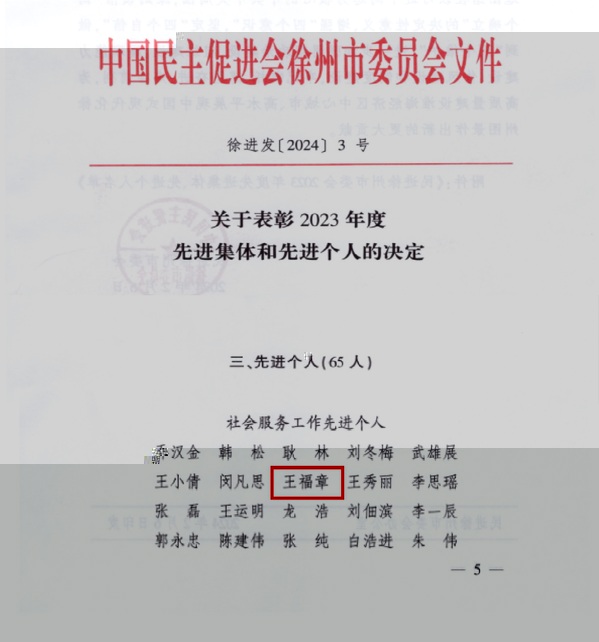 近日,中國民主促進會徐州市委員會召開工作會議,對2023年度先進集體和先進個人進行了表彰,我院民進會員王福章副教授被評為社會服務工作先進個人。