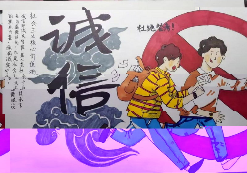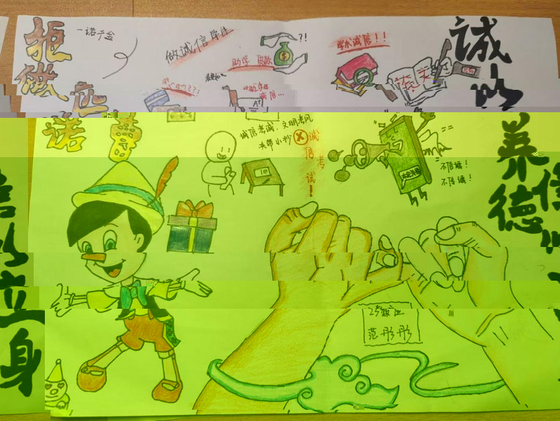 此次活動受到了同學們的熱烈響應和積極參與。學生通過查閱豐富的誠信相關故事和資料,深入理解了誠信在社會各領域中的核心價值和重要性,随後将自身的理解和感悟融入畫作之中,以獨特的創意和熟練的技藝展現了誠信的深遠意義。本次活動引導同學們認識到了誠信的重要性,了解到了誠信作為道德準則所發揮的重要作用。誠信不僅是做人做事的道德核心,也是道德教育與素質教育的重要内容,從而促使同學們牢記守信為榮,失信可恥的道德理念,養成誠信的行為習慣。