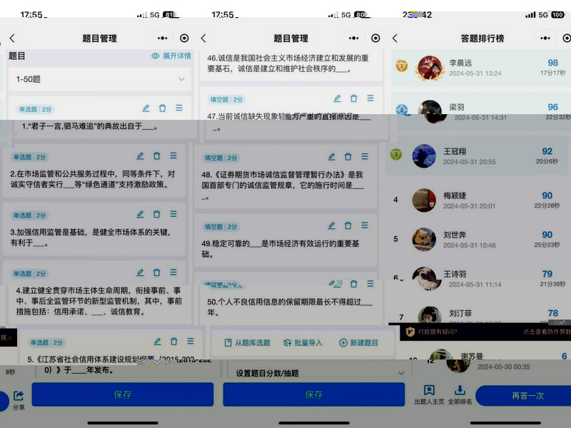 競賽采取線上答題的模式,競賽試題分為填空題、選擇題及判斷題三個部分,着重考察選手們對于資助政策,征信和金融基本常識的了解程度,幫助建立對誠信知識的理解,加深自身品格修養。比賽期間,參賽選手們将通過小程序參與競賽,憑借着對自律和誠信的認知,認真回答學習通中的試題,展現出良好的道德素養和紮實的知識儲備。這場比賽是對知識的檢驗,更是對品德的考量。