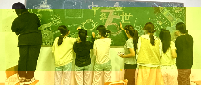 承先人之光,深我輩之思想,為青年奮鬥培根鑄魂。同學們按照時間軸,深入了解新中國曆史,從開國大典到改革開放再到新時代蓬勃發展,每一個重要事件都以繪畫的形式保留在黑闆之上,更生生烙印于每位同學的心中,每一個畫面都凝聚着每位數統學子的拳拳愛國心。
